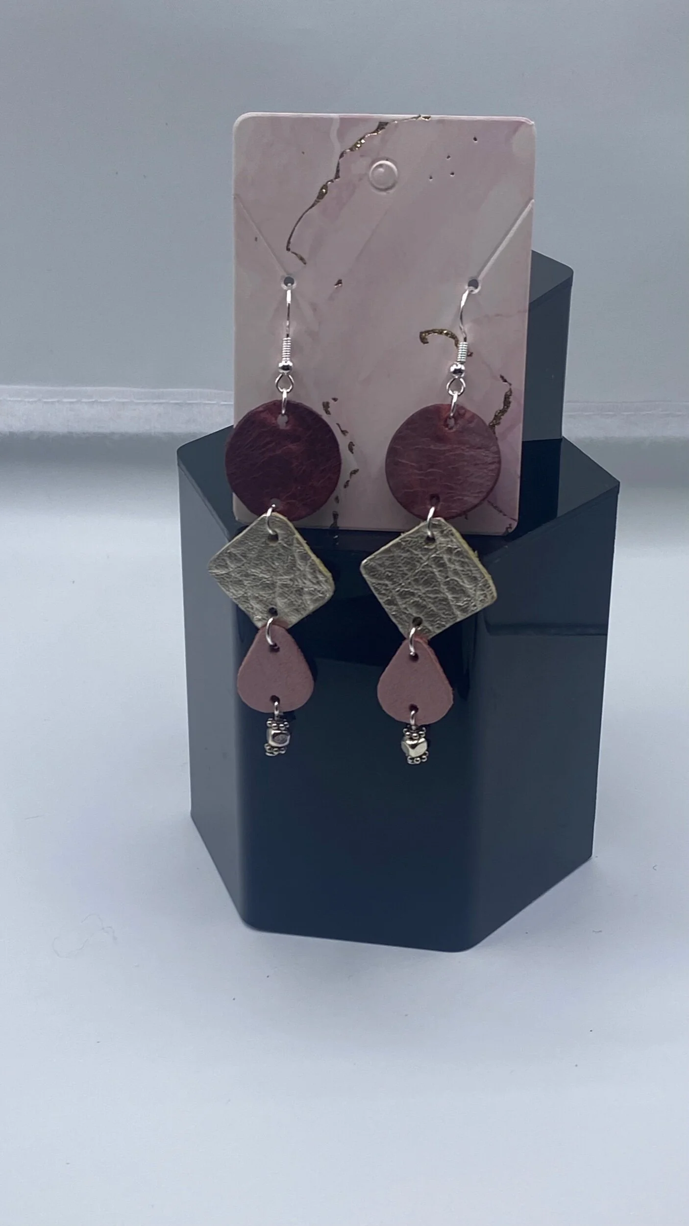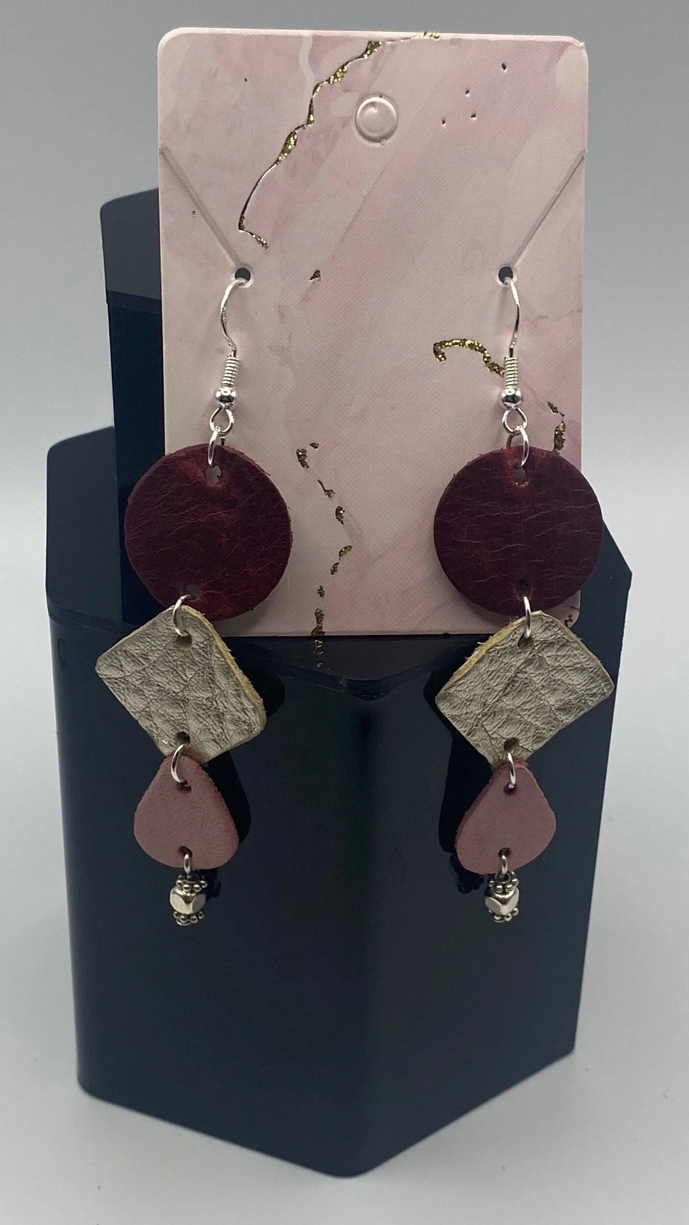 Image 1 of 5 Image 2 of 5 Image 3 of 5 Image 4 of 5 Image 5 of 5 Geometric Recycled Red, Gold, & Pink Leather Earrings $50.00 Made with Love andRecycled leatherSilver-plated square and round embellishments925 sterling silver ear hooks and wires Add To Cart Added! Made with Love andRecycled leatherSilver-plated square and round embellishments925 sterling silver ear hooks and wires